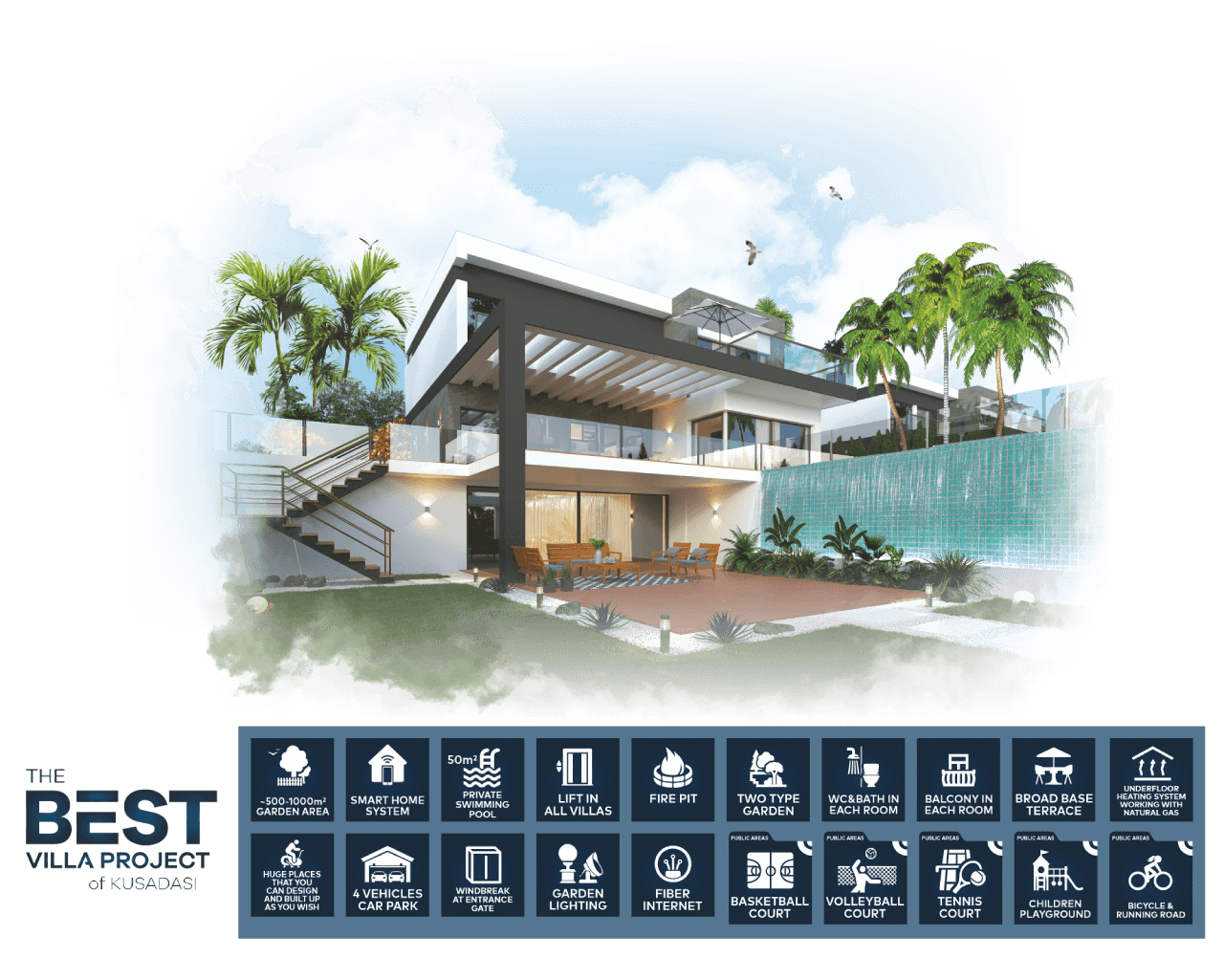 Lena Ekicioğlu Villas offers many privileges to make the life of the owners easier and to offer them a modern and comfortable life. Each villa has its own 50 m2 private pool, waterfall pool, sun lounging pool, private parking lot, underfloor heating system working with natural gas, fireplace, kitchen cellar area, fire pits and large areas that can be designed catering to our customer’s need optionally on the garden floor. We offer privileges that will take your living standards to the next level such as smart home systems, modern lighting systems, garden lightings, first-class sanitary ware and toiletries, and 24/7 security service. In addition, there is a common field of 3000 square meters in the middle of the site; In this area it is planned to build, basketball and volleyball courts, tennis courts, playgrounds as well as the walking and cycling paths.